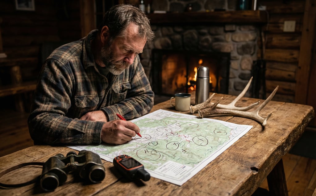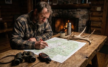 • Terrain features on your property map that you've never placed a camera on: thick drainages, hollow heads, swamp edges, south-facing slopes. If you can identify these features on a map but have no camera data from them, that's a scouting assignment, not a coincidence.